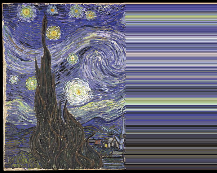 Manipulation numérique d’après différents moyens au travers divers logiciels, afin d’altérer l’esthétisme de grandes oeuvres ayant marquées l’histoire de l’art. Altération par le logiciel audacity, par traitement de texte, étirement de pixels ou par le logiciel processing.