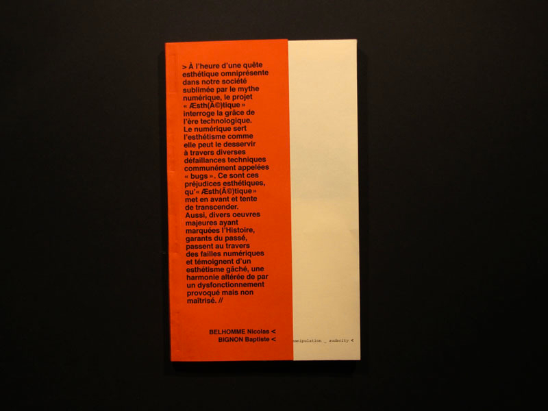 Questionnement relatif à la place qu’occupe le numérique dans notre monde actuel et sa quête esthétique indéniable. La technologie sert l’esthétisme comme elle peut le desservir au travers diverses défaillances technique communément appelées «bugs» ou «artéfact». C’est ce que le projet Æsth(é)tique tente de transcender.